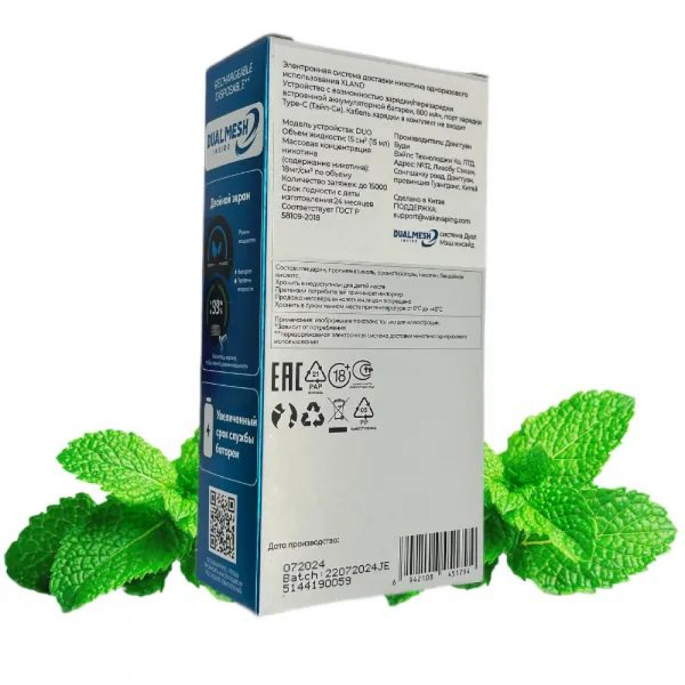 | ИспарительDual Mesh | Количество затяжек, шт15000 | ЛинейкаWAKA XLAND |